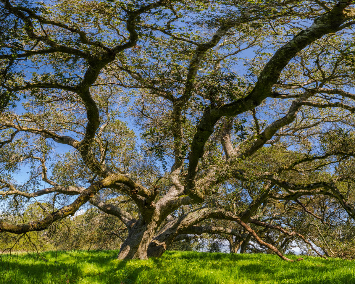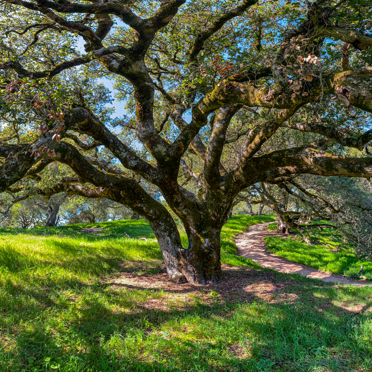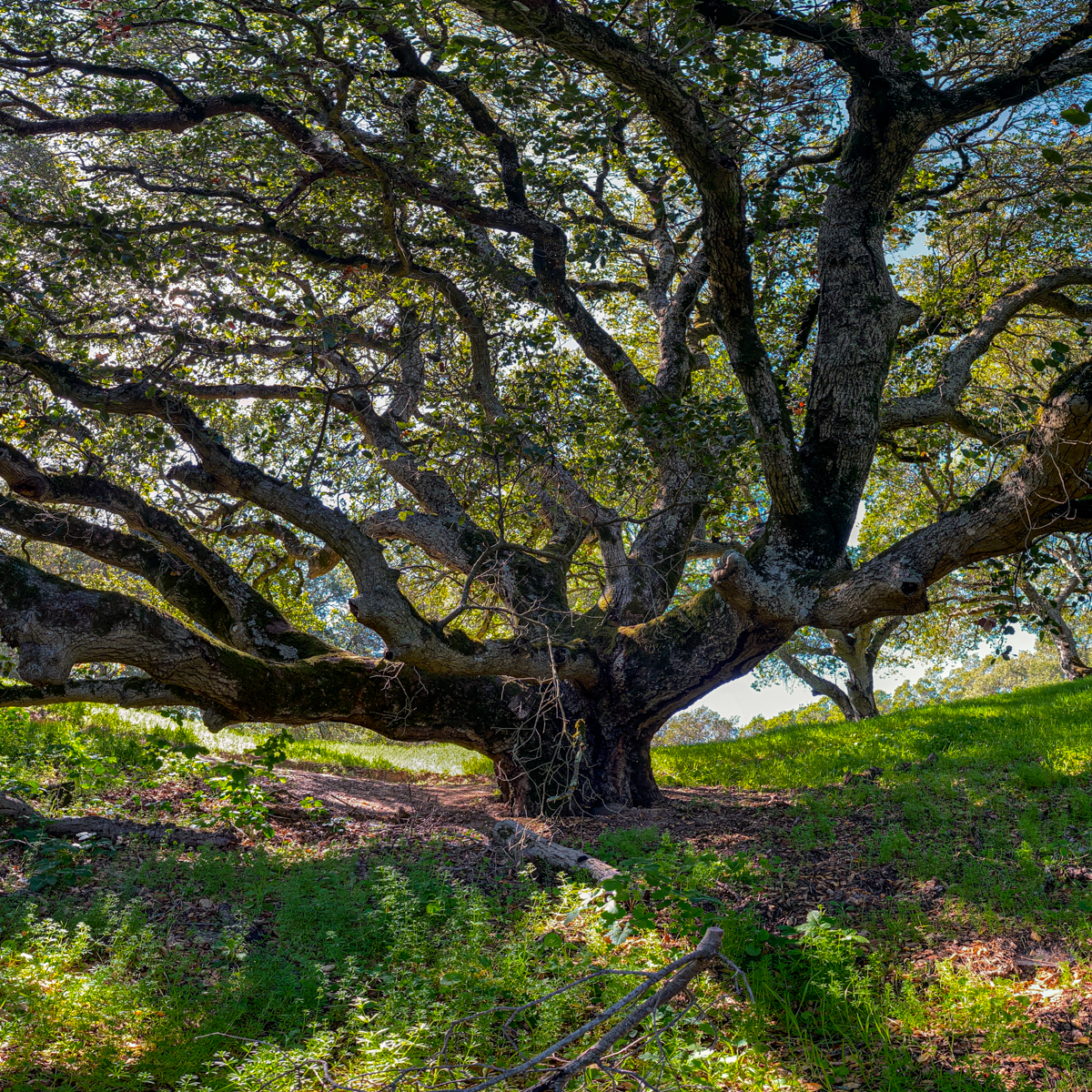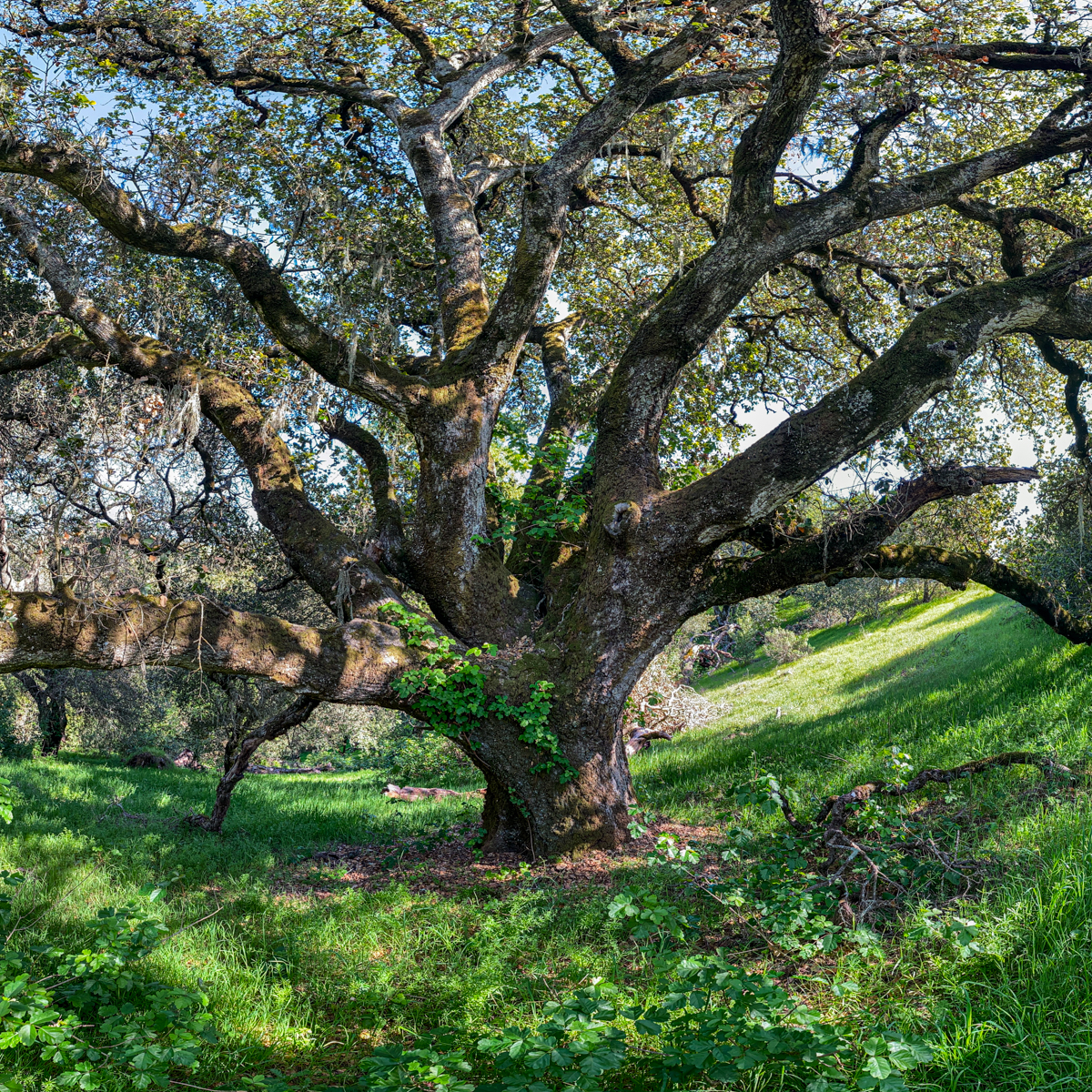 Photographic mosaics of the elder oak trees of the Helen Putnam Regional Park in Sonoma County. These grand old trees are hundreds of years old; they are witnesses to the changes to the landscape that has taken place in California since the arrival of The Europeans. The portraits are high-resolution photographic mosaics composed from up to 50 individual photographs captured from under the tree canopy in a quarter-spherical pattern. These images are then digitally stitched together and flattened, in a manner similar to a map of the spherical globe, to create these enveloping images. Portraits of Elder Oaks is an ongoing photographic project.