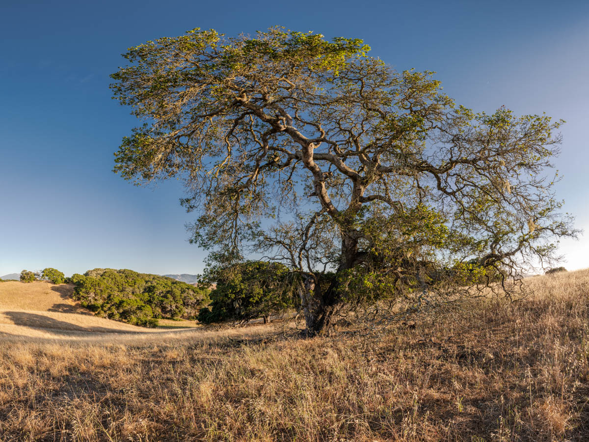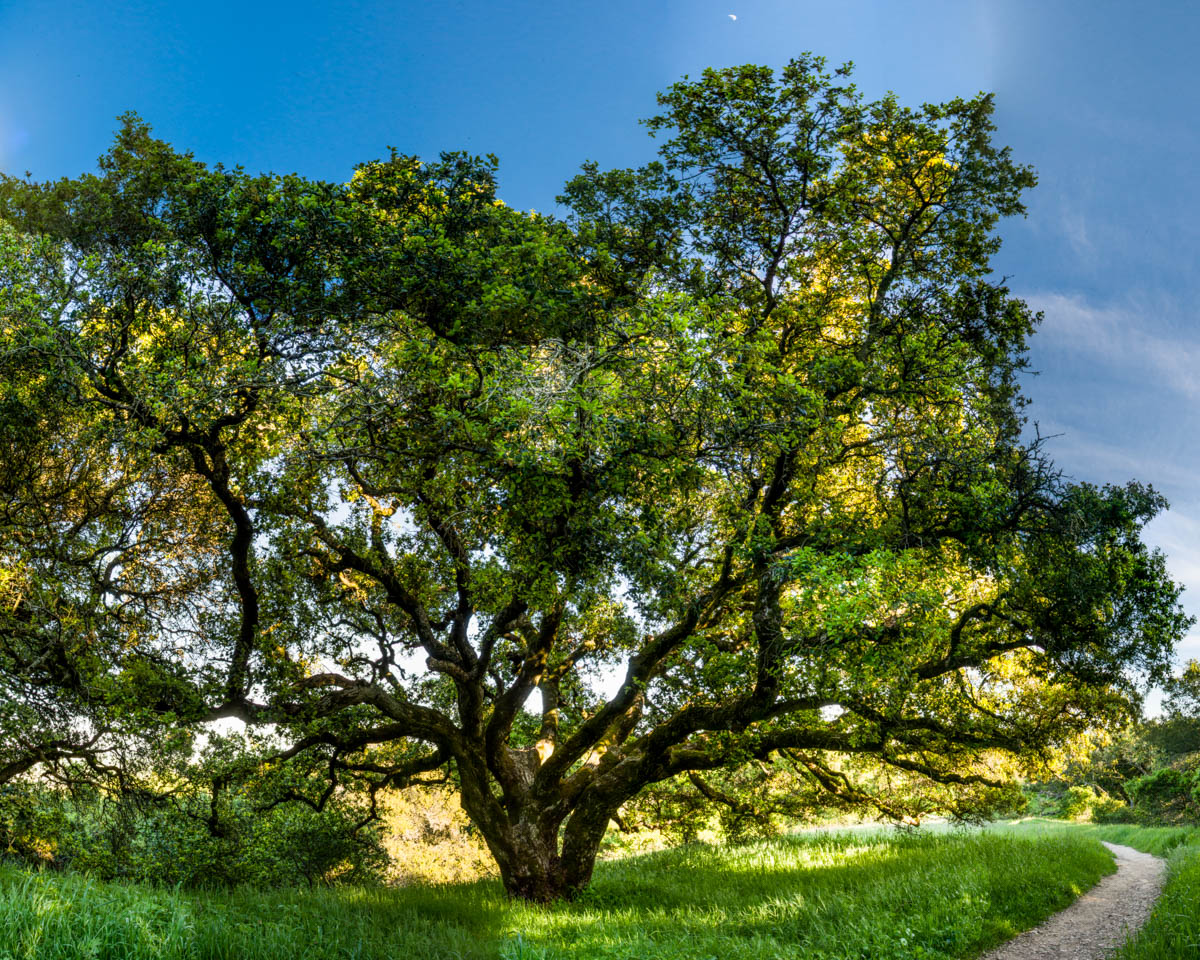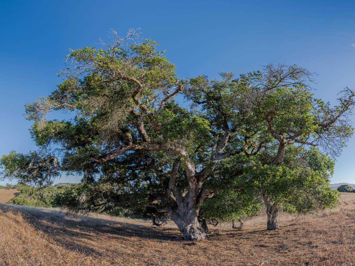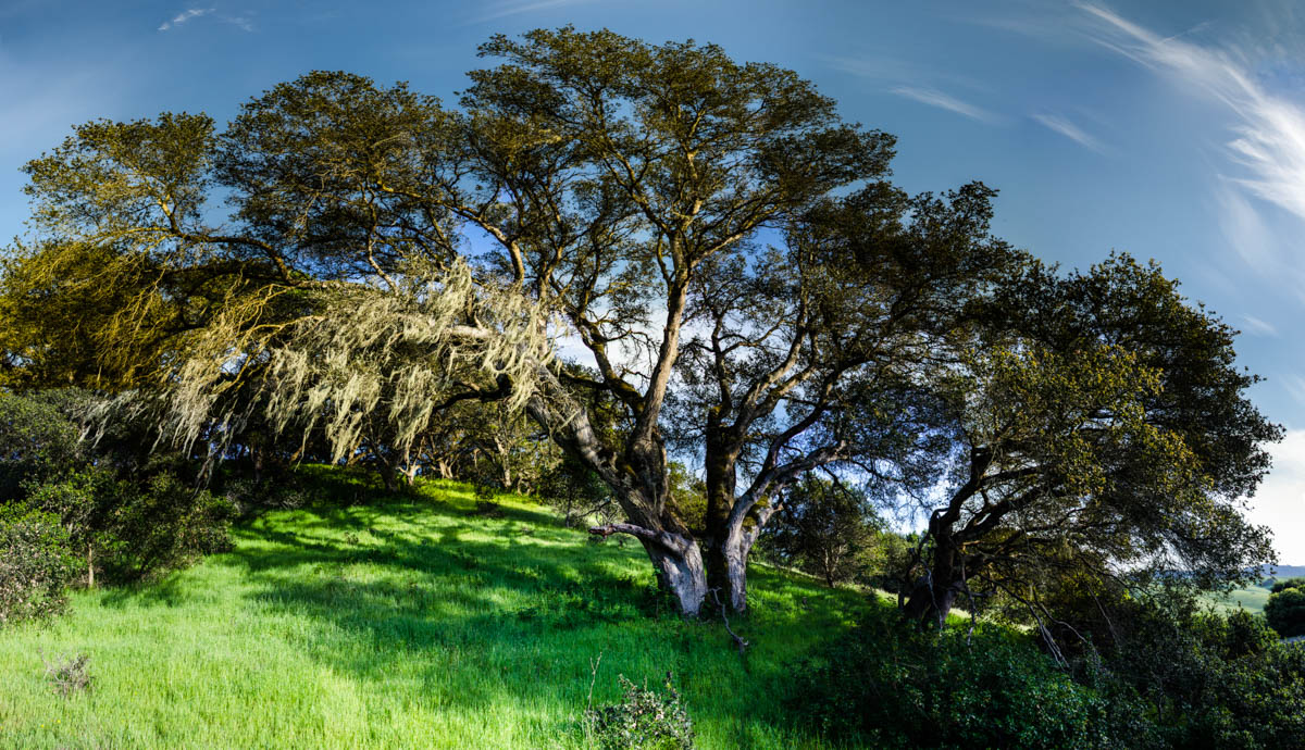 Photographic mosaics of the elder oak trees of the Helen Putnam Regional Park in Sonoma County. These grand old trees are hundreds of years old; they are witnesses to the changes to the landscape that has taken place in California since the arrival of The Europeans. The portraits are high-resolution photographic mosaics composed from up to 50 individual photographs captured from under the tree canopy in a quarter-spherical pattern. These images are then digitally stitched together and flattened, in a manner similar to a map of the spherical globe, to create these enveloping images. Portraits of Elder Oaks is an ongoing photographic project.