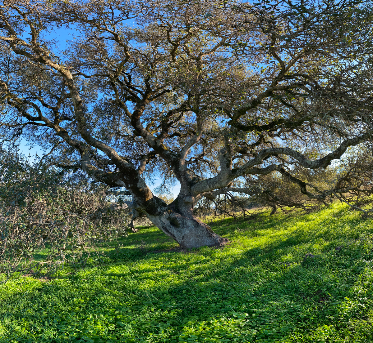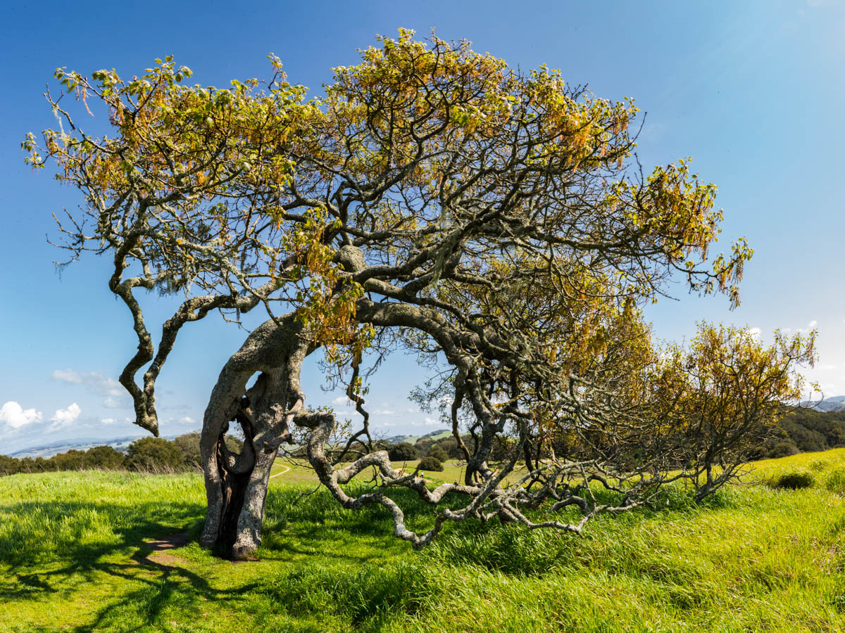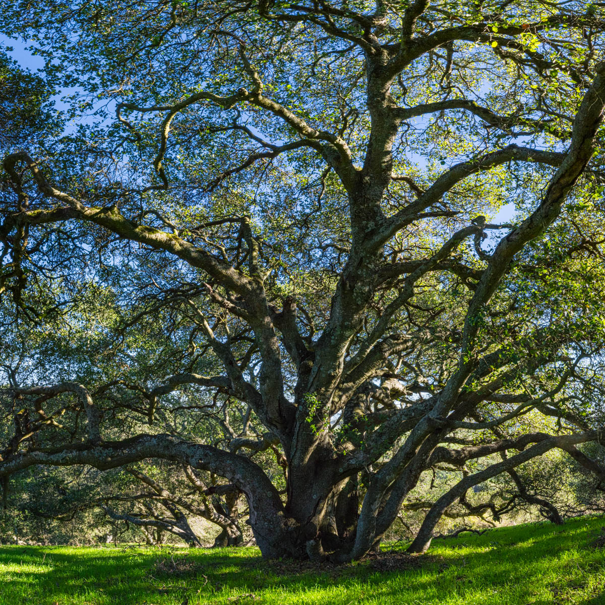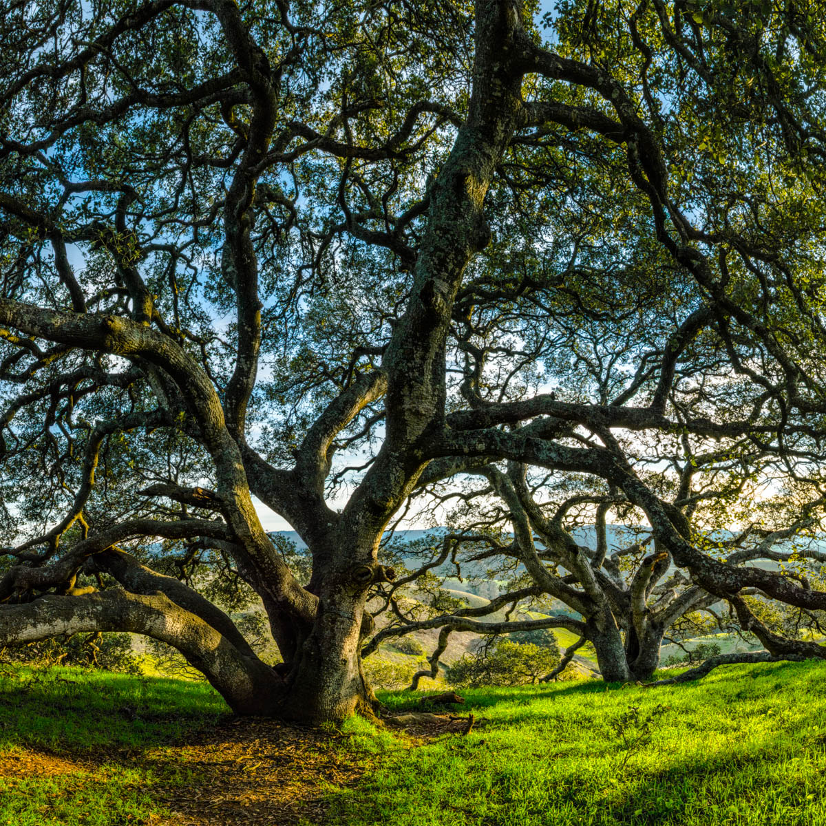 Photographic mosaics of the elder oak trees of the Helen Putnam Regional Park in Sonoma County. These grand old trees are hundreds of years old; they are witnesses to the changes to the landscape that has taken place in California since the arrival of The Europeans. The portraits are high-resolution photographic mosaics composed from up to 50 individual photographs captured from under the tree canopy in a quarter-spherical pattern. These images are then digitally stitched together and flattened, in a manner similar to a map of the spherical globe, to create these enveloping images. Portraits of Elder Oaks is an ongoing photographic project.