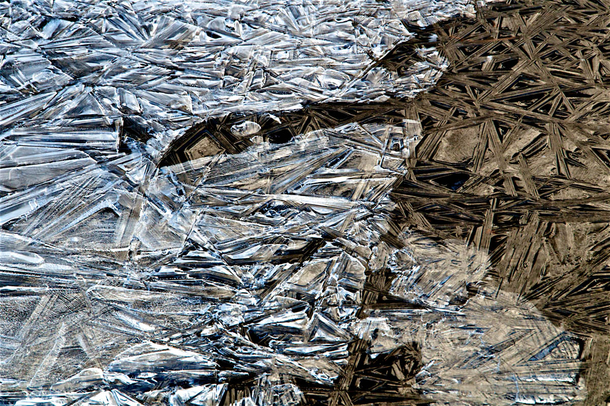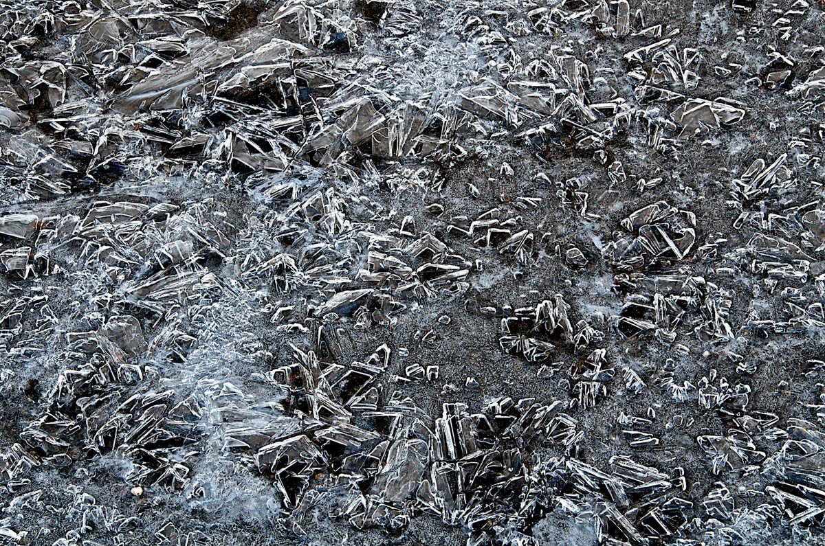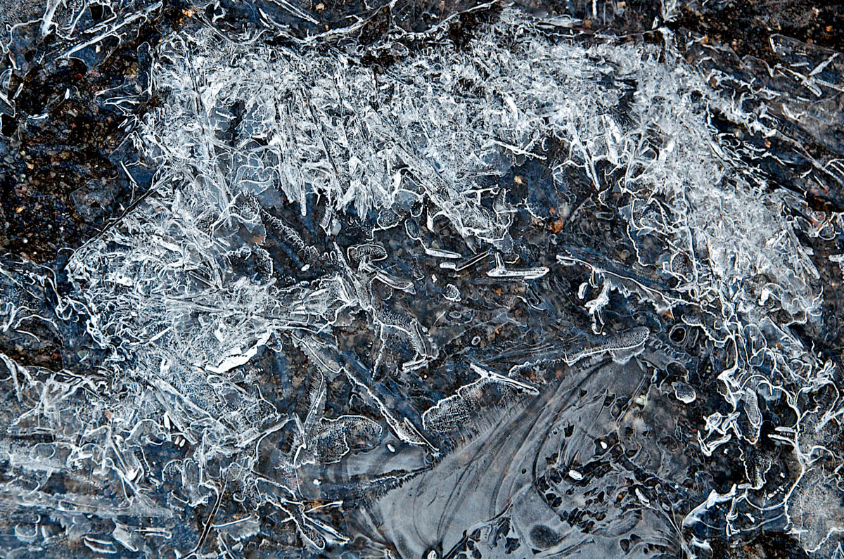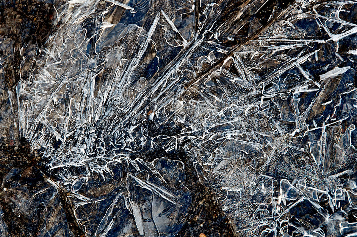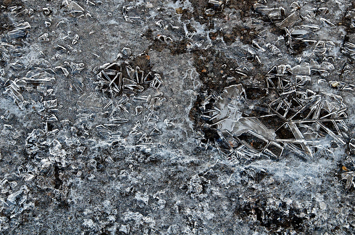 The human species, everywhere, imprints the natural world. The asphalt roadway, a human artifact, has a structural, chemical, and thermal impact on the thawing-freezing process of ice, with repeated cycles creating complex, overlaying patterns of crystals: landscapes in miniature. The images were captured in April 2011 near Donner Pass, California. The photographs were taken early in the morning, as the sun was rising above 20 foot snowdrifts surrounding the roadway.