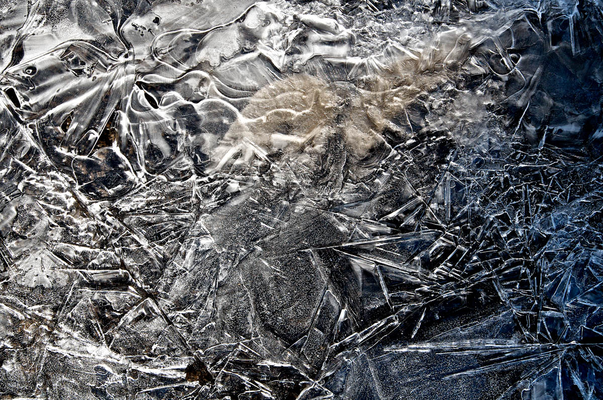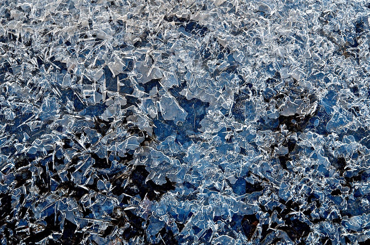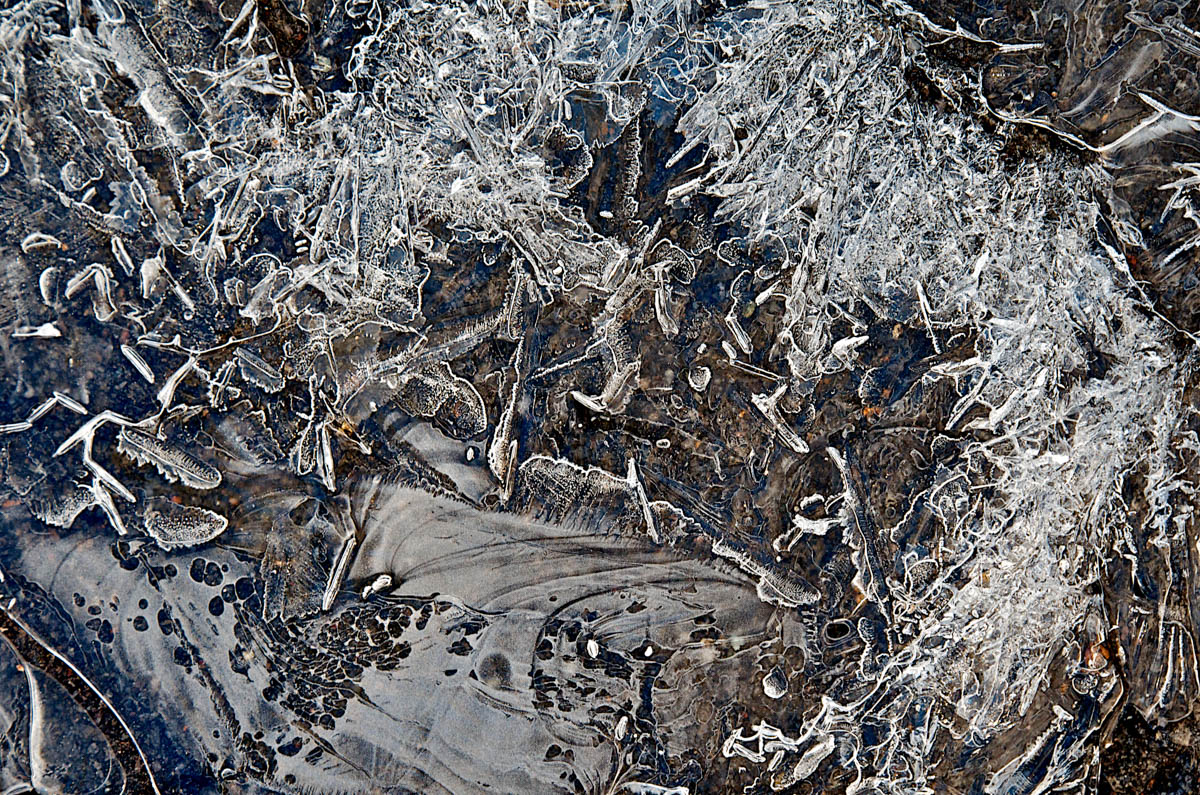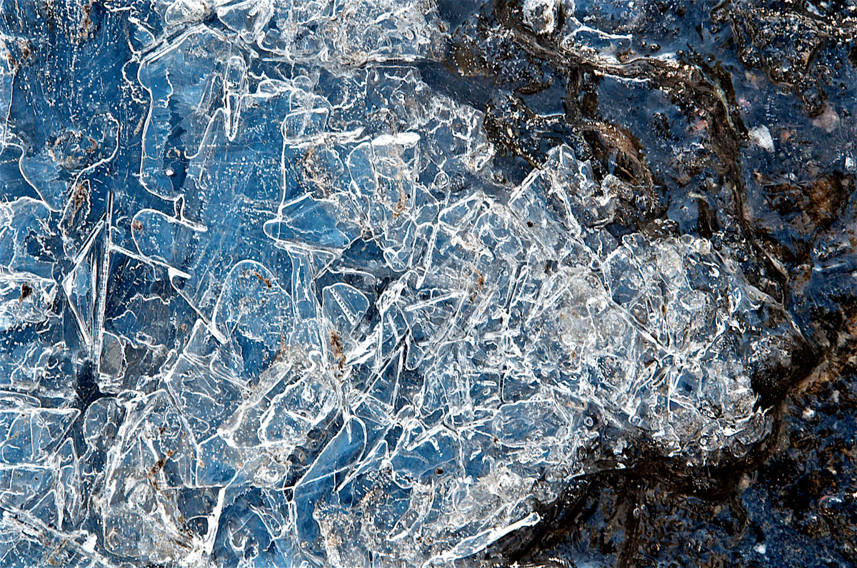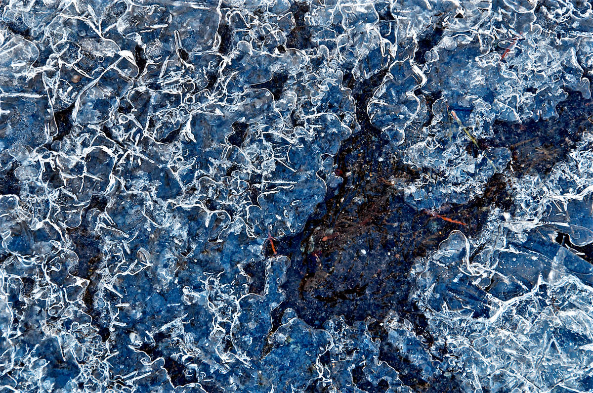 The human species, everywhere, imprints the natural world. The asphalt roadway, a human artifact, has a structural, chemical, and thermal impact on the thawing-freezing process of ice, with repeated cycles creating complex, overlaying patterns of crystals: landscapes in miniature. The images were captured in April 2011 near Donner Pass, California. The photographs were taken early in the morning, as the sun was rising above 20 foot snowdrifts surrounding the roadway.