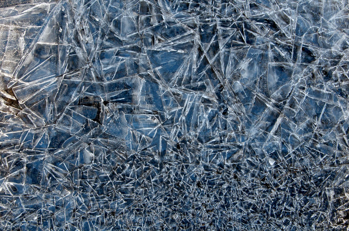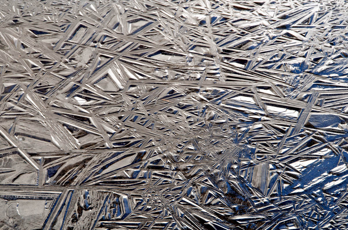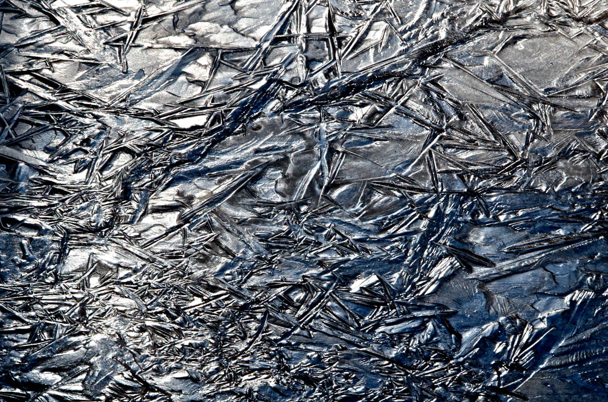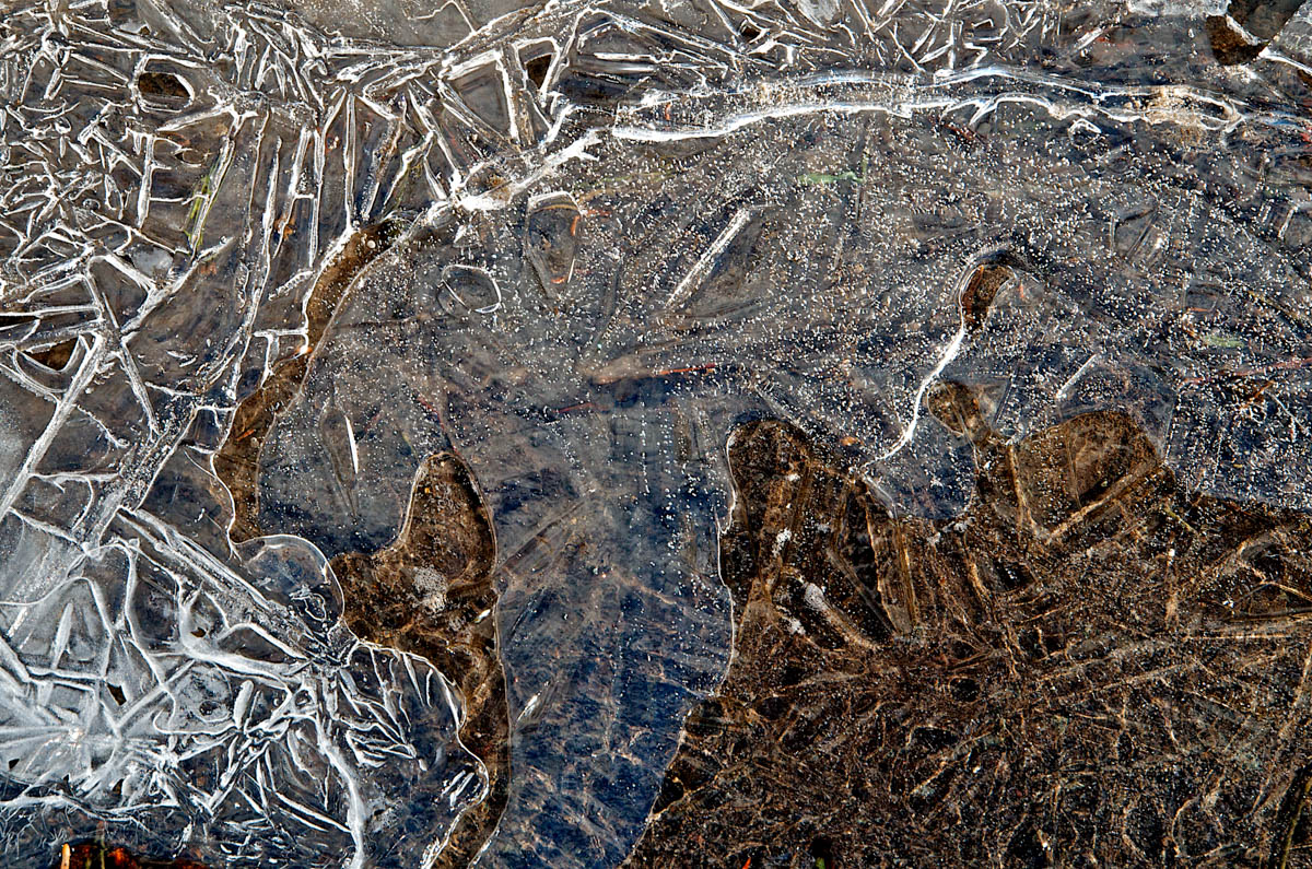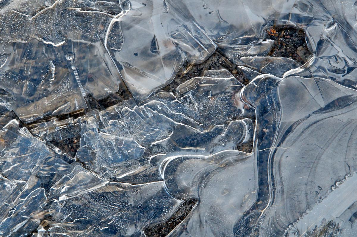 The human species, everywhere, imprints the natural world. The asphalt roadway, a human artifact, has a structural, chemical, and thermal impact on the thawing-freezing process of ice, with repeated cycles creating complex, overlaying patterns of crystals: landscapes in miniature. The images were captured in April 2011 near Donner Pass, California. The photographs were taken early in the morning, as the sun was rising above 20 foot snowdrifts surrounding the roadway.