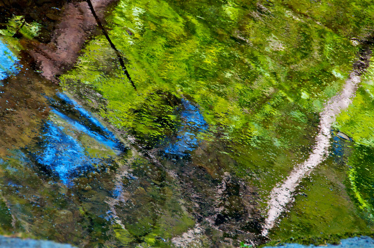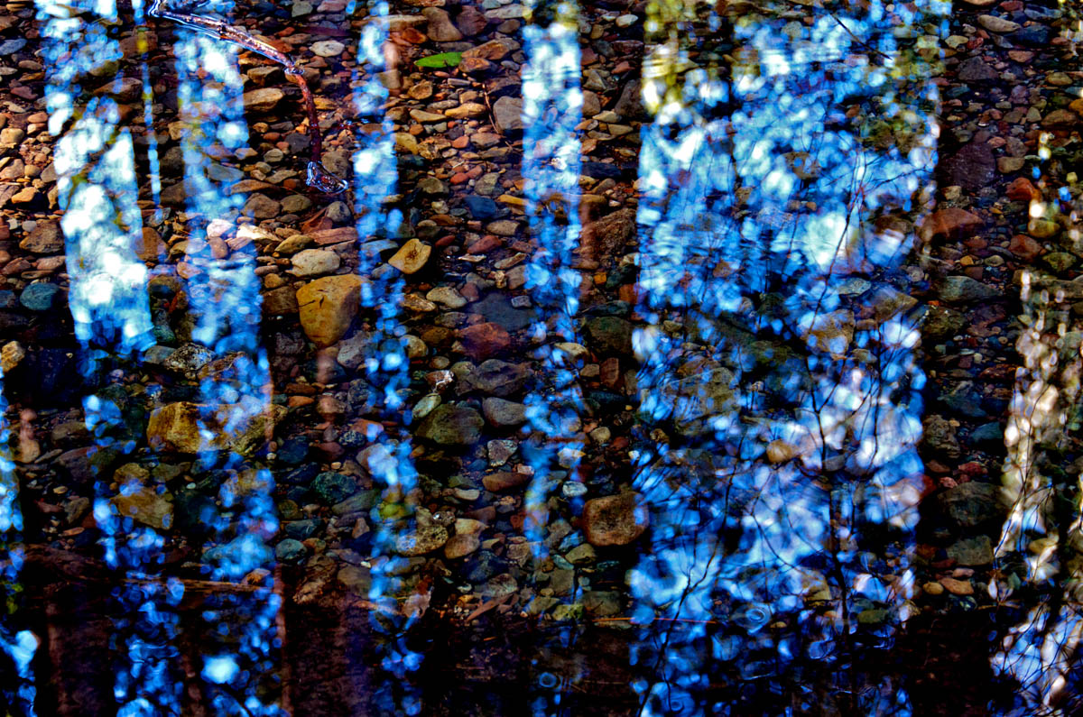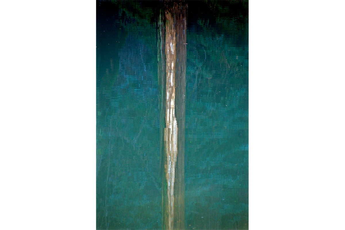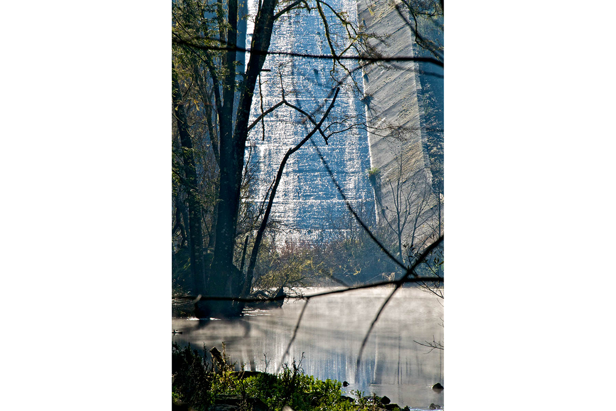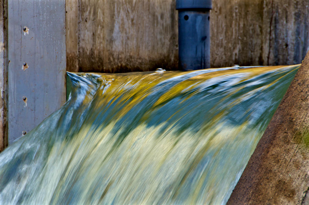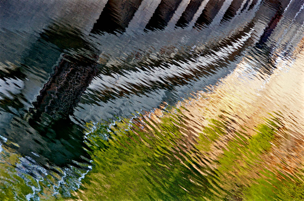 The story is told through photographic watercolor prints with imagery of the surface of the water -refracting and reflecting its surroundings, and of the human-constructions that alter flow of water, and the landscape, to meet human needs.