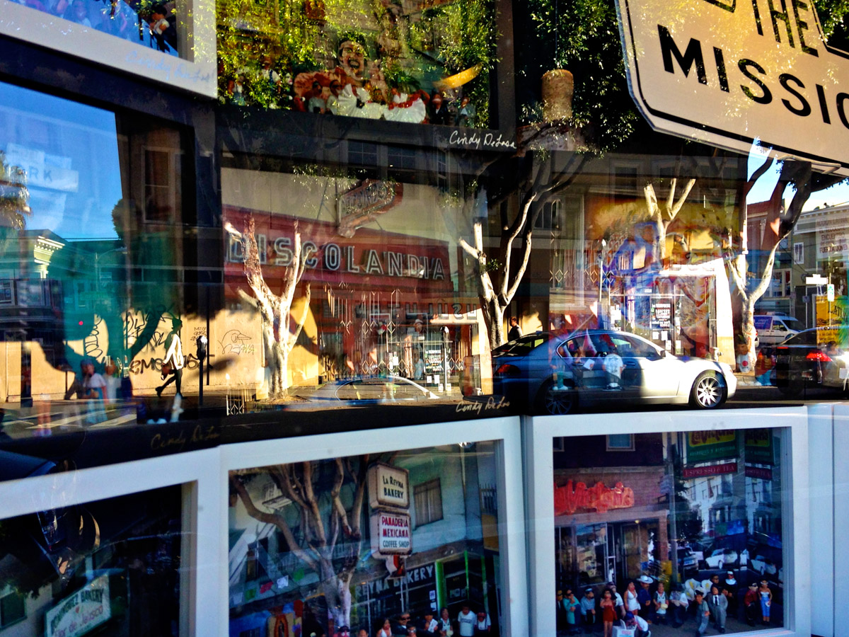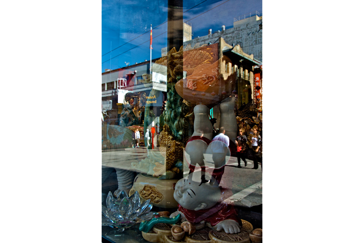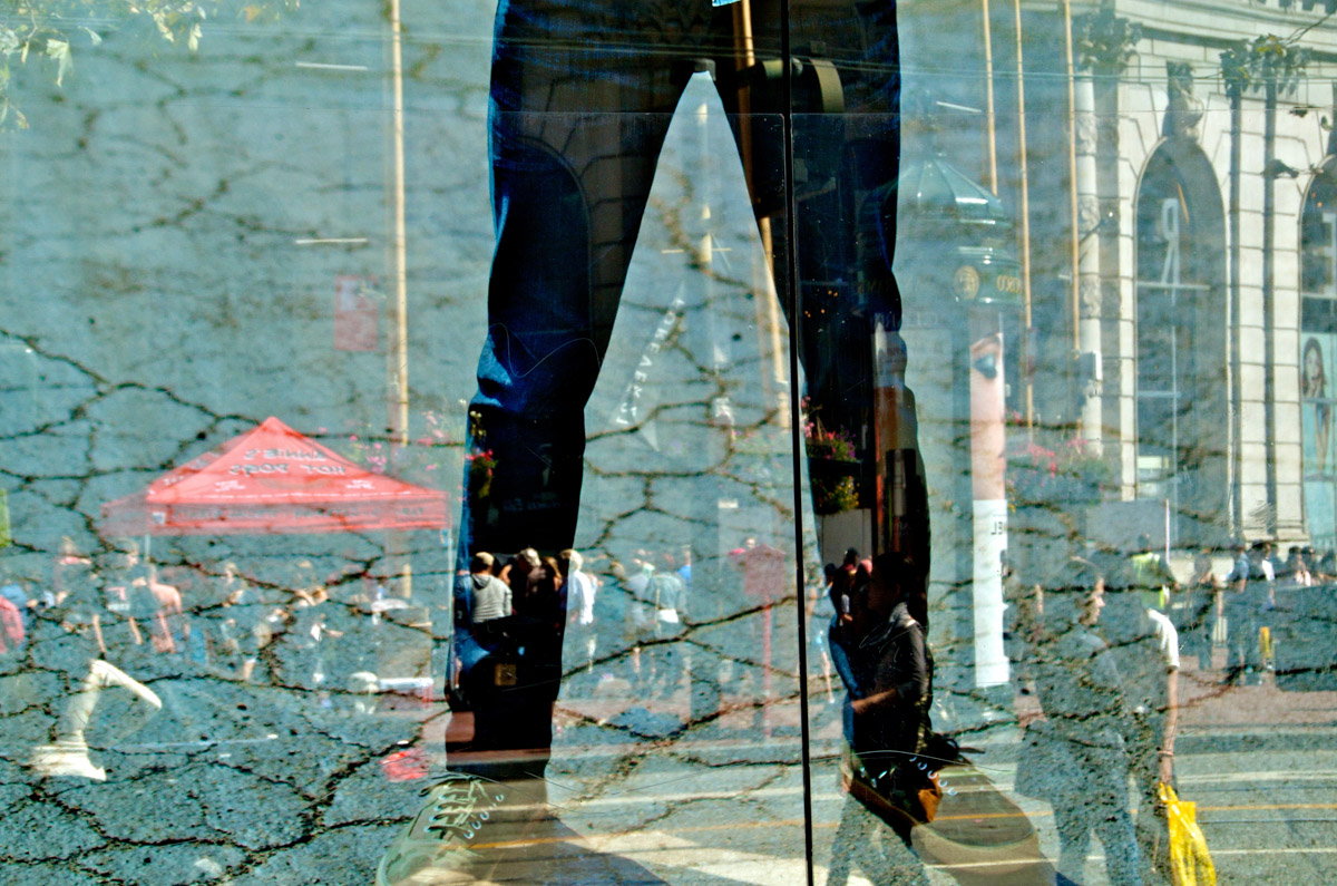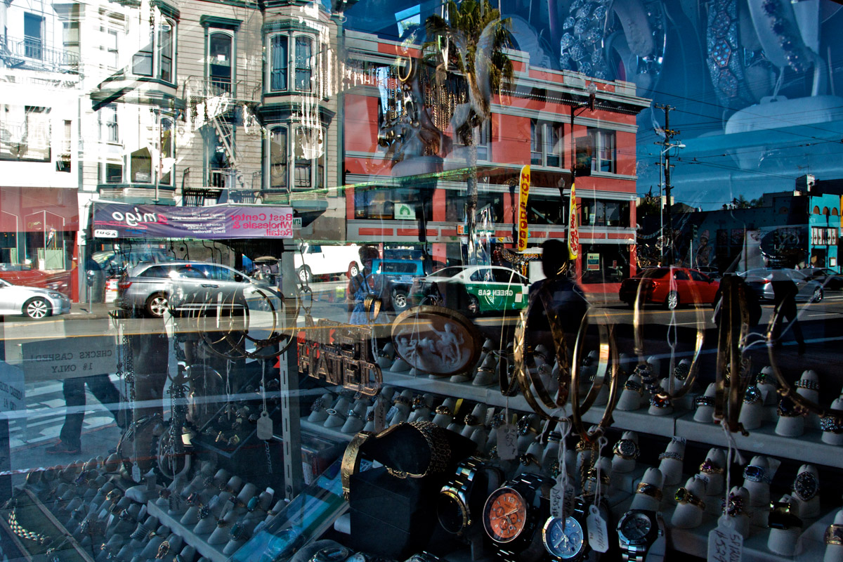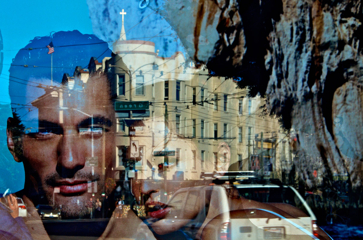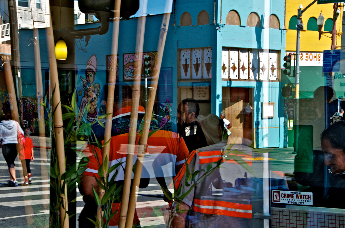 My intent, with these photographs, was to express the kaleidoscopic experience of the urban environment, and the many diverse facets of this unique American city, at this point in its history. I use a technique that I call windowpane which provides an ideal medium of expression for this subject, using the reflection/refraction of window glass to create spatially and semiotically rich photographic images, captured spontaneously and serendipitously in the tradition of the flaneur.