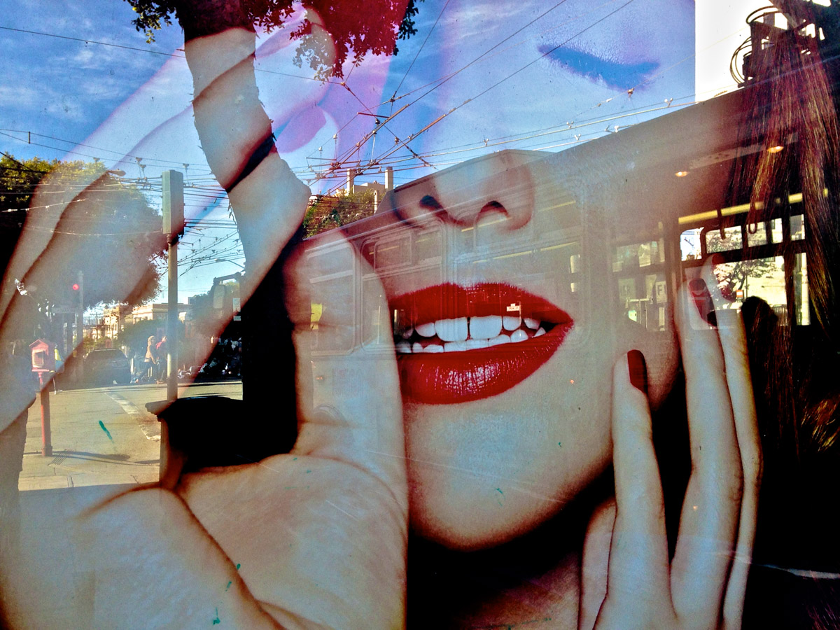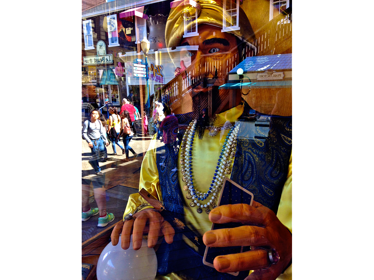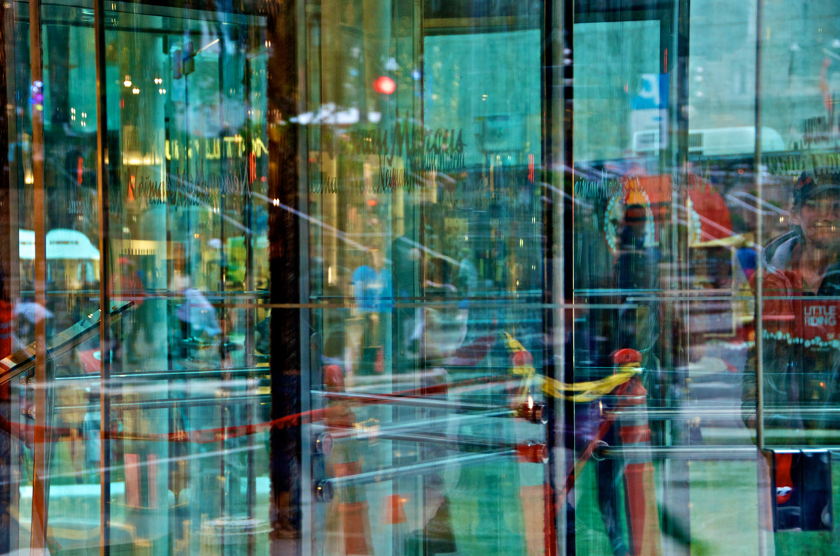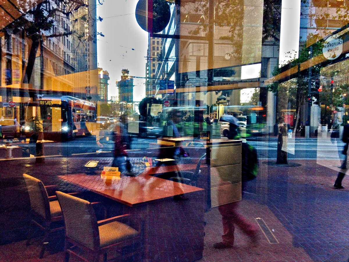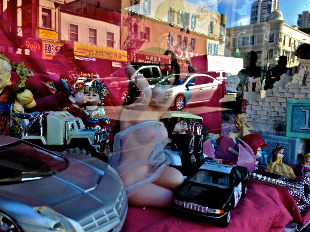 My intent, with these photographs, was to express the kaleidoscopic experience of the urban environment, and the many diverse facets of this unique American city, at this point in its history. I use a technique that I call windowpane which provides an ideal medium of expression for this subject, using the reflection/refraction of window glass to create spatially and semiotically rich photographic images, captured spontaneously and serendipitously in the tradition of the flaneur.