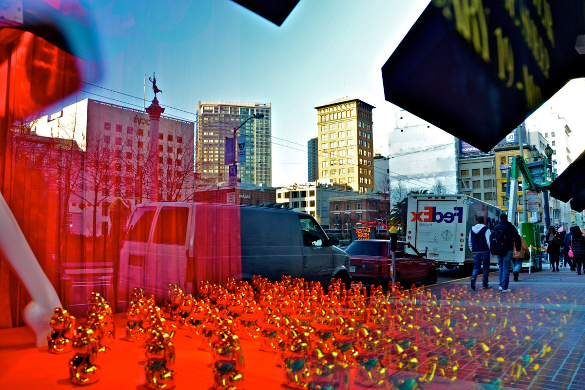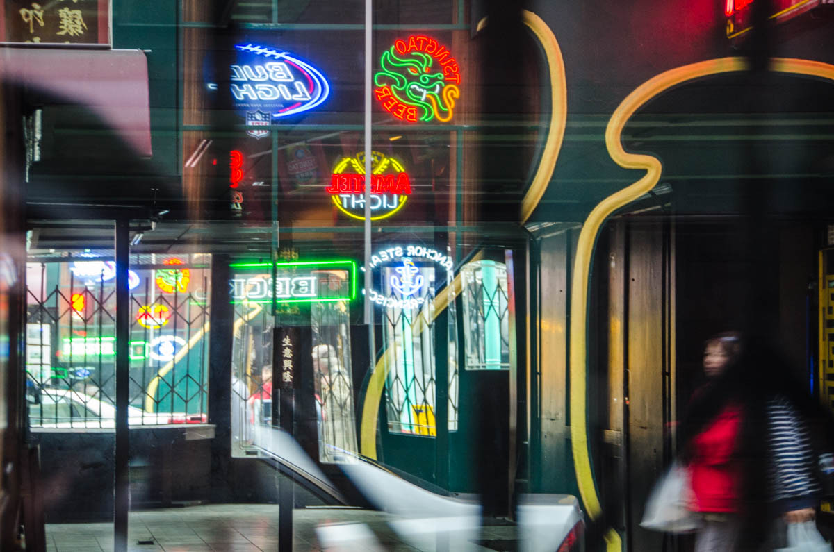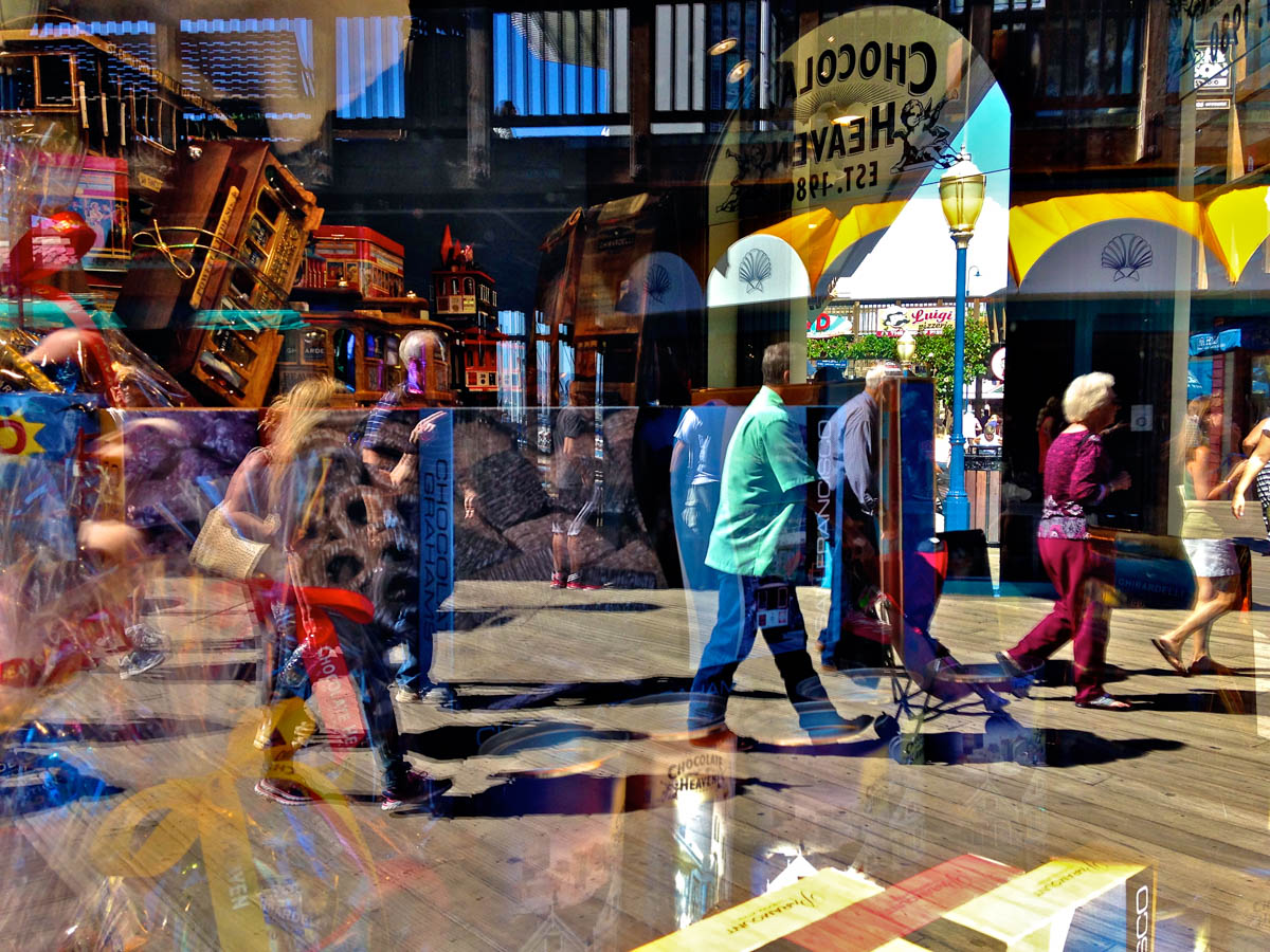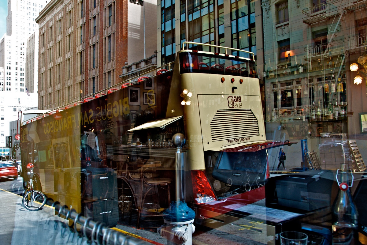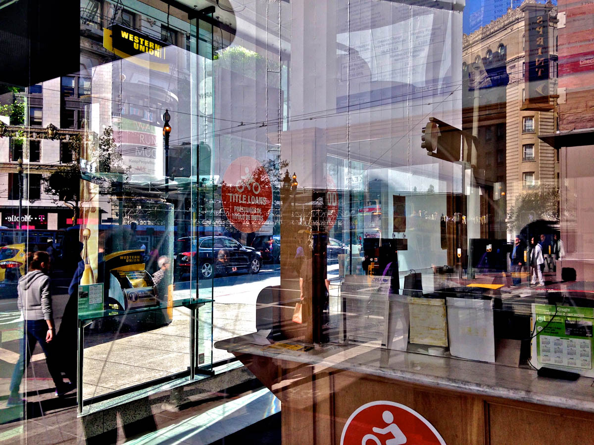 My intent, with these photographs, was to express the kaleidoscopic experience of the urban environment, and the many diverse facets of this unique American city, at this point in its history. I use a technique that I call windowpane which provides an ideal medium of expression for this subject, using the reflection/refraction of window glass to create spatially and semiotically rich photographic images, captured spontaneously and serendipitously in the tradition of the flaneur.