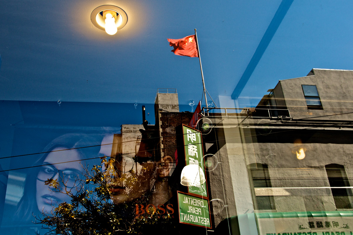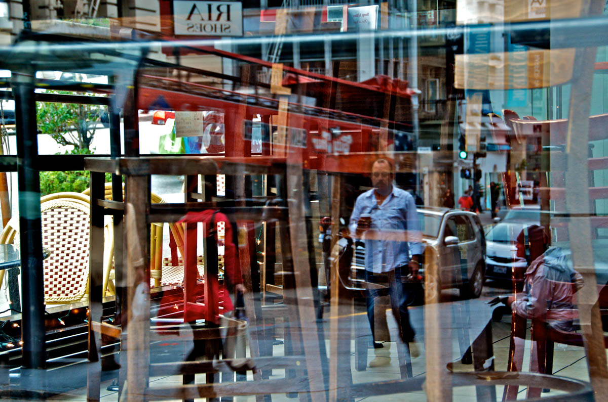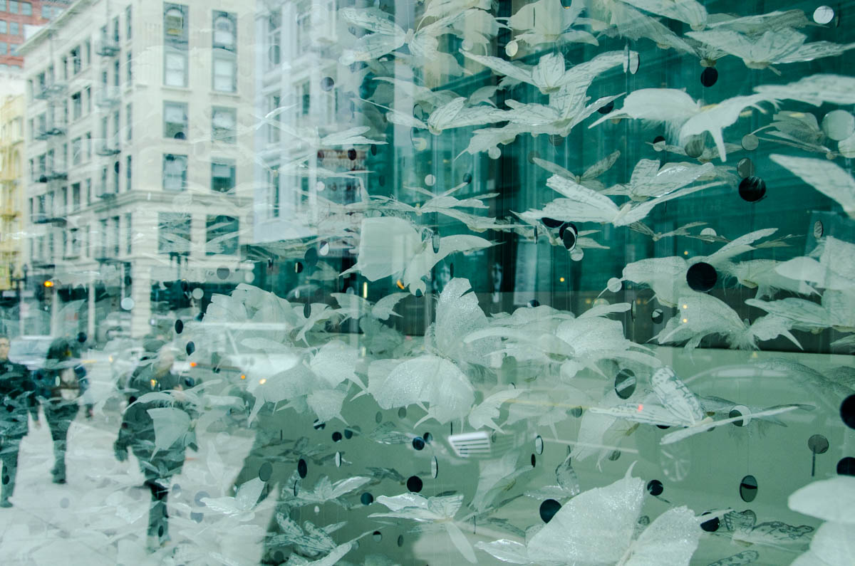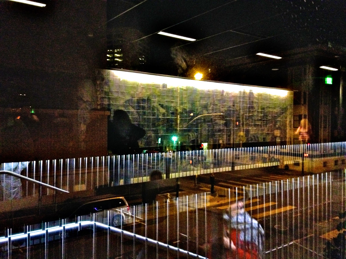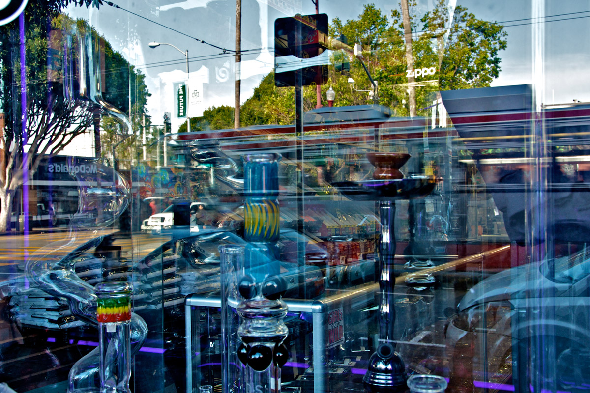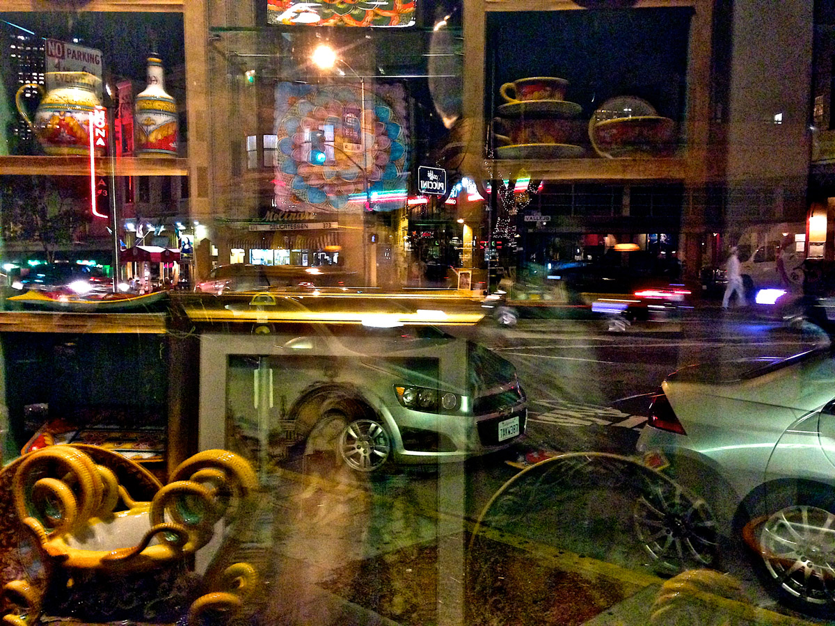 My intent, with these photographs, was to express the kaleidoscopic experience of the urban environment, and the many diverse facets of this unique American city, at this point in its history. I use a technique that I call windowpane which provides an ideal medium of expression for this subject, using the reflection/refraction of window glass to create spatially and semiotically rich photographic images, captured spontaneously and serendipitously in the tradition of the flaneur.